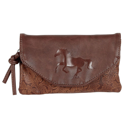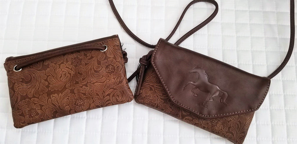 The look of tooling is featured on this cross-body, string purse. Comes with a snap closure and 3 inside pockets, one with a zipper. This Bag can double as a wallet or purse.