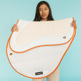 The Breeze saddle pad is available with its matching half pad made with 0.5” thick high-resiliency foam. It is slightly thinner than the Flip Half Pad (0.75” foam) and is not shimmable. The underside of the Breeze Half Pad is 100% breathable non-slip material.